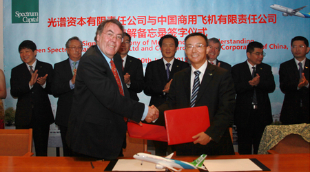 中國(guó)經(jīng)濟(jì)網(wǎng)訊 2012年7月10日,范堡羅航展第二天,中國(guó)商飛公司與光譜資本有限責(zé)任公司(以下簡(jiǎn)稱光譜公司)在英國(guó)倫敦簽署諒解備忘錄。
