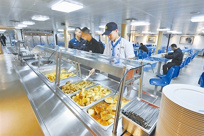 適應(yīng)航母全時工作理念,航母餐廳在正餐基礎(chǔ)上設(shè)置了間餐,提供糕點、水果飲料等,保證了艦員隨時能吃到可口的食品。