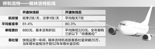 實(shí)施快線前,呼錫線上的機(jī)票基本沒有折扣,單程票價(jià)為880元。快線實(shí)施后,該航線每張票平均降低了320元,并且全年都有三折以下的“特惠艙位”。