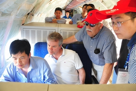 FAA、CAAC審查代表在飛機機艙內(nèi)審查試飛相關數(shù)據(jù)。