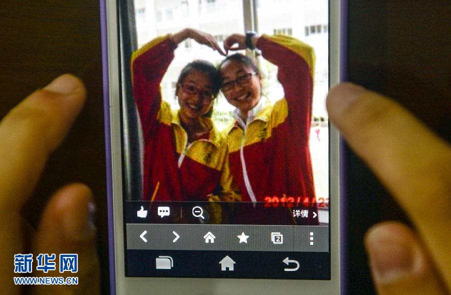7月8日,江山中學(xué)高一(10)班一名學(xué)生在手機(jī)上展示QQ空間里王琳佳(右)和葉夢(mèng)圓的合影。在韓亞航空舊金山墜機(jī)事故中不幸罹難的兩名中國(guó)乘客,是浙江省江山中學(xué)高一年級(jí)的學(xué)生王琳佳和葉夢(mèng)圓。她們從初中起就是同學(xué),是很要好的朋友。兩人的離去,給師友留下無(wú)盡的思念。新華社記者韓傳號(hào)攝