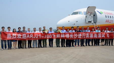 中國經(jīng)濟網(wǎng)航空訊 據(jù)中國商飛公司報道,2013年7月15日上午10時19分,ARJ21-700飛機103架機從閻良中國試飛院機場起飛,由試飛員劉宏亮、郭寶駕機,經(jīng)過1小時38分的轉(zhuǎn)場飛行,于11時57分順利抵達(dá)長沙,標(biāo)志著2013年高溫高濕試飛正式拉開帷幕。按照計劃,103架機將進(jìn)行環(huán)控、液壓等系統(tǒng)相關(guān)科目的試飛和地面試驗。