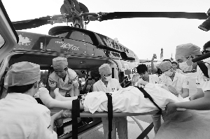 昨日早上5時(shí)整,999直升機(jī)從密云機(jī)場(chǎng)起飛;5時(shí)23分,急救直升機(jī)抵達(dá)999清河急救中心停機(jī)坪。5分鐘后,救護(hù)車載著老人抵達(dá)!奥c(diǎn)!慢點(diǎn)!讓開車門,小心直升機(jī)尾翼!”一位渾身包著繃帶、戴著頸托的老人被抬出了救護(hù)車,老人緊閉雙眼,顯得十分虛弱。擔(dān)架上的老人被小心翼翼地移上直升機(jī)。旋即,直升機(jī)騰空而起,前往天津?yàn)I海國(guó)際機(jī)場(chǎng)。