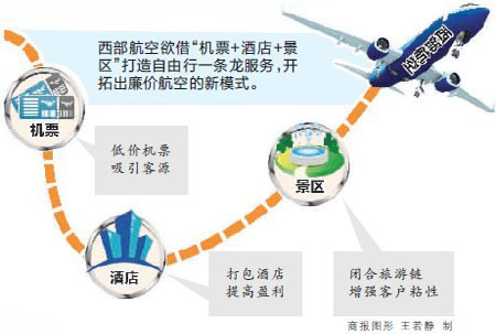 廉價航空如何構(gòu)建自己的商業(yè)生態(tài)?這是宣布轉(zhuǎn)型低成本后的西部航空的一大難題。昨日,商報記者獲悉,為打開局面,西部航空宣布拉長產(chǎn)業(yè)鏈,進(jìn)軍旅游市場,將重點打造“機票+酒店”的組合旅游模式,探路低成本航空運作商業(yè)生態(tài)鏈。這意味著西部航空的盈利觸角,將延伸到下游的在線旅游市場。對此,在線旅游服務(wù)企業(yè)表示,歡迎航空公司打包產(chǎn)品通過他們來銷售,但航空公司若想壟斷資源來搶食,恐不受歡迎。