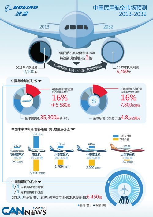 中國市場領(lǐng)先的飛機(jī)制造商波音公司預(yù)測,未來20年,中國將需要5580架新飛機(jī),總價(jià)值達(dá)7800億美元。波音今天在北京發(fā)布了2013年中國市場展望,預(yù)測到2032年中國民航機(jī)隊(duì)的規(guī)模將達(dá)到現(xiàn)有機(jī)隊(duì)的三倍。