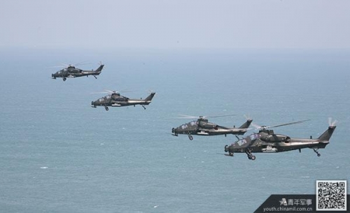 中國陸航武直-10進行海上編隊超低空突防演練。(司啟富攝)