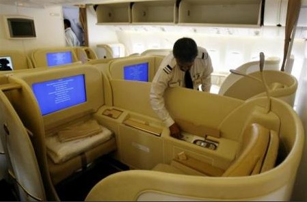 波音777-200環(huán)球客機頭等艙座椅寬敞,調(diào)節(jié)幅度大,座位前安裝大屏幕電視。
