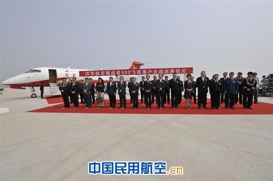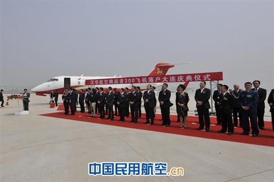 上圖為:漢華航空首架挑戰(zhàn)者300飛機(jī)落戶大連儀式現(xiàn)場