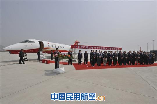 在歡迎儀式上,漢華公務(wù)機(jī)航空有限公司總裁楊建新、大連國際機(jī)場集團(tuán)有限公司副總經(jīng)理杜志淵、大連港口口岸局局長高連分別致辭。楊建新總裁對各位來賓的光臨表示了熱烈的歡迎和衷心的感謝,漢華公務(wù)機(jī)航空有限公司首架挑戰(zhàn)者300型飛機(jī)的成功引進(jìn)并正式落戶大連,得到了民航東北地區(qū)管理局、大連市人民政府以及大連國際機(jī)場和其他各有關(guān)方面的大力支持協(xié)助,首架飛機(jī)的入列,標(biāo)志著漢華公務(wù)機(jī)航空有限公司進(jìn)入了新的發(fā)展階段,飛機(jī)投入運營后,公司將始終不渝地堅持“安全第一,預(yù)防為主,綜合治理”的指導(dǎo)思想,堅持高起點、高標(biāo)準(zhǔn)、嚴(yán)要求,確保飛行安全,努力將漢華航空打造成中國一流公務(wù)機(jī)航空服務(wù)品牌。大連市港口口岸局局長高連在致辭中對漢華航空首架飛機(jī)的成功引進(jìn)表示熱烈的祝賀,對楊建新總裁為首的接機(jī)人員表示親切慰問,衷心希望漢華航空以此為起點,不斷加強(qiáng)企業(yè)管理,苦練內(nèi)功,努力創(chuàng)造新的輝煌,將漢華航空打造成為大連市的一張靚麗的名片,為促進(jìn)東北亞航運中心建設(shè)和帶動其他產(chǎn)業(yè)發(fā)展作出應(yīng)有的貢獻(xiàn)。大連國際機(jī)場集團(tuán)有限公司副總經(jīng)理杜志淵在致辭中指出,漢華航空引進(jìn)的首架挑戰(zhàn)者300型飛機(jī)也是首架正式落戶大連的公務(wù)機(jī),是大連國際機(jī)場的一件大事,機(jī)場方面將不斷完善公務(wù)機(jī)運行服務(wù)保障工作,為航空公司的安全運營積極創(chuàng)造有利的環(huán)境和條件。
