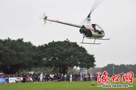 12月17日,2011中國首屆環(huán)海南島飛行拉力賽在?谂e行;顒蝇F(xiàn)場規(guī)模空前,扣人心弦,精彩紛呈。據(jù)悉,本次飛行拉力賽至本月30日止。圖為直升機定位“投籃”賽現(xiàn)場