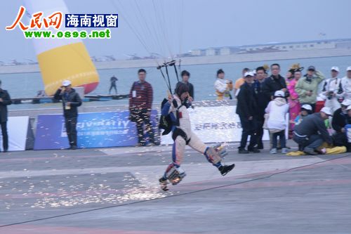 17日上午,2011環(huán)海南飛行拉力賽在?谂e行了隆重的開幕儀式。直升機(jī)同心圓旋轉(zhuǎn)、模型機(jī)超低空飛行、跳傘隊上演“七仙女下凡”……八一跳傘隊、河南跳傘隊、翱翔中國航空模型特技飛行表演隊等在萬綠園旁人工島上演了一場華麗的飛行表演秀,一系列超乎想象的精彩表演讓現(xiàn)場觀眾嘆為觀止。