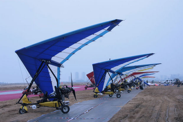 在?谑腥f(wàn)綠園后觀海臺(tái)賽點(diǎn),動(dòng)力懸掛滑翔機(jī)整裝待發(fā)