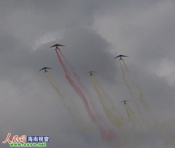 29日的萬(wàn)寧晴空萬(wàn)里,飛行特技運(yùn)動(dòng)員們?cè)缭绫阕龊昧藴?zhǔn)備,熱氣球、動(dòng)力滑翔傘、三角翼、航空模型等飛行器材也準(zhǔn)備完畢,早上10點(diǎn),隨著歡樂(lè)的音樂(lè)響起,率先飛過(guò)場(chǎng)地的是捧著彩帶的三角翼編隊(duì)。