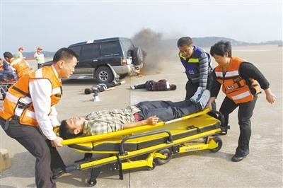 隨后,人員疏散時出現(xiàn)踩踏現(xiàn)象,救護車因道路擁堵無法將傷員送往附近醫(yī)院救治,交通運輸部南海第一救助飛行隊使用直升機將傷員運往市區(qū)救治,聞訊而來的傳媒和群眾急切要求公布傷亡人員名單和事故真相,海事部門搜救落水飛行員,特種設備部門調(diào)查墜機原因,有關部門三度召開新聞發(fā)布會并采用微博等方式及時公布信息……演練指揮人員沉著應對,各救援組協(xié)同作戰(zhàn)。