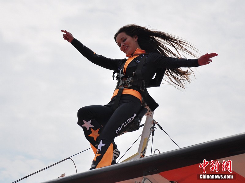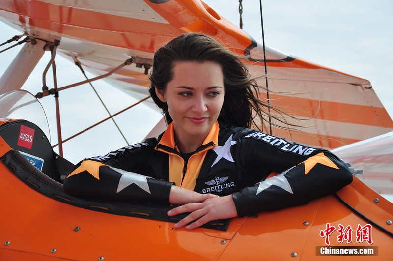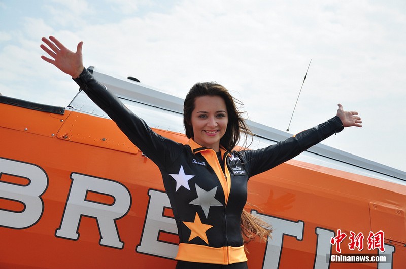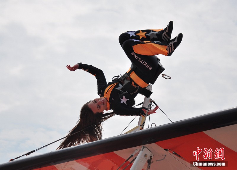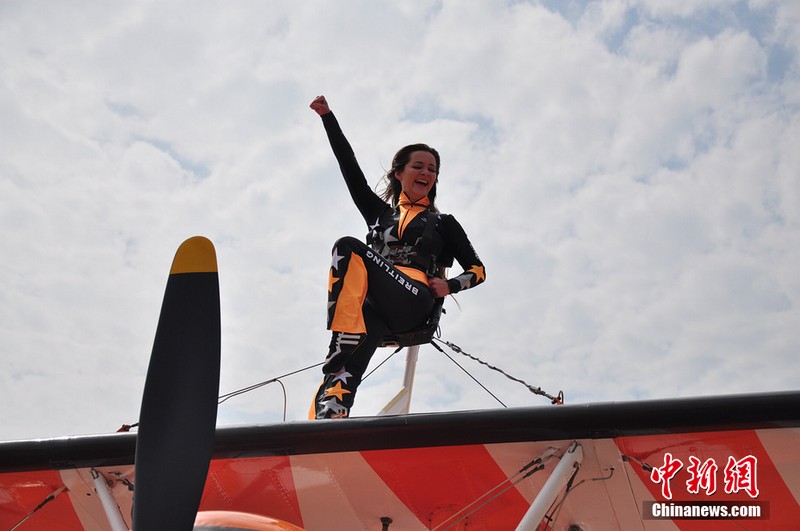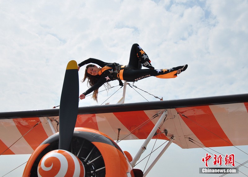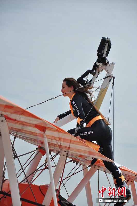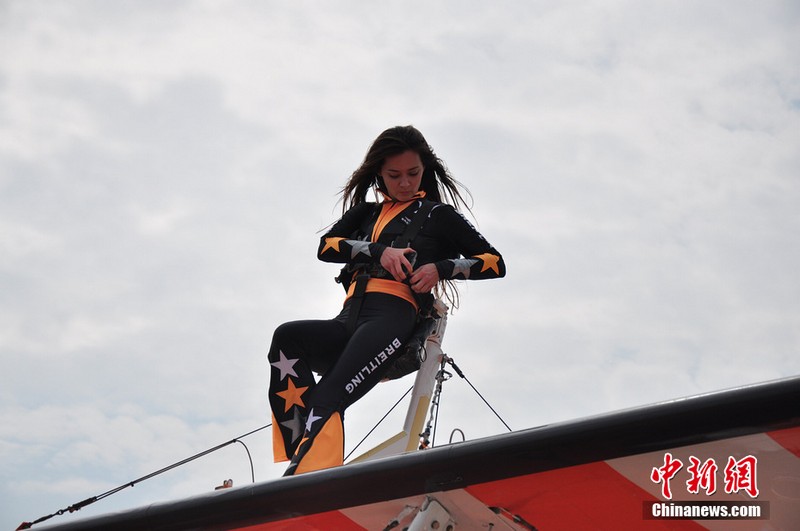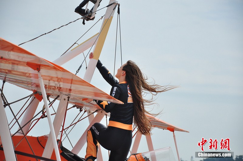 11月11日,歐洲“百年靈”機(jī)翼行走飛行表演隊(duì)的美女表演者在地面停放的飛機(jī)上進(jìn)行了表演動(dòng)作展示。