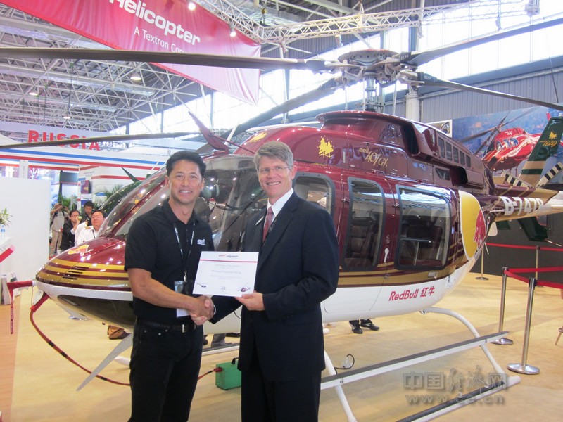 中國經(jīng)濟(jì)網(wǎng)珠海航展特派記者團(tuán)訊 著名演員兼明星飛行員王敏德獲得貝爾直升機(jī)公司總裁兼首席執(zhí)行官約翰·加里森頒發(fā)“貝爾直升機(jī)中國大使”證書。王敏德將代表貝爾直升機(jī)公司出席各類活動(dòng)。王敏德是一名合資格的飛行員, 持有貝爾直升機(jī)飛行執(zhí)照。