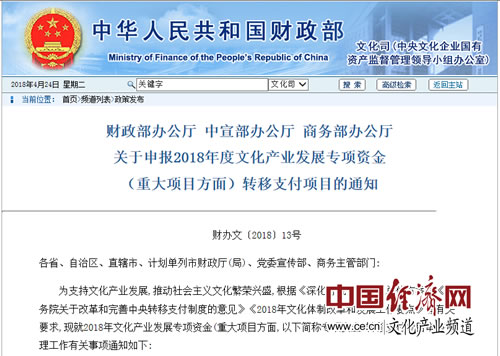經(jīng)濟(jì)日?qǐng)?bào)-中國(guó)經(jīng)濟(jì)網(wǎng)北京4月24日訊 近日,財(cái)政部辦公廳、中宣部辦公廳和商務(wù)部辦公廳聯(lián)合下發(fā)了關(guān)于申報(bào)2018年度文化產(chǎn)業(yè)發(fā)展專項(xiàng)資金(重大項(xiàng)目方面)轉(zhuǎn)移支付項(xiàng)目的通知(以下簡(jiǎn)稱“通知”)。根據(jù)通知,專項(xiàng)資金將直接補(bǔ)助推動(dòng)影視產(chǎn)業(yè)發(fā)展和對(duì)外文化貿(mào)易發(fā)展的重大項(xiàng)目。