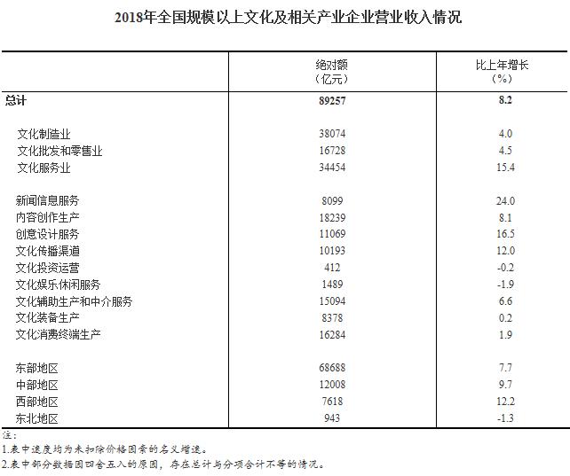 經(jīng)濟(jì)日報-中國經(jīng)濟(jì)網(wǎng)北京1月31日訊 今天,國家統(tǒng)計局公布了2018年規(guī)模以上文化及相關(guān)產(chǎn)業(yè)生產(chǎn)經(jīng)營季度報告。報告顯示,據(jù)對全國規(guī)模以上文化及相關(guān)產(chǎn)業(yè)6.0萬家企業(yè)調(diào)查,2018年,上述企業(yè)實(shí)現(xiàn)營業(yè)收入89257億元,比上年增長8.2% (按可比口徑計算。為名義增長,未扣除價格因素。按照《文化及相關(guān)產(chǎn)業(yè)分類(2018)》新標(biāo)準(zhǔn)測算,上述企業(yè)2017年實(shí)現(xiàn)的營業(yè)收入為82456億元。)。