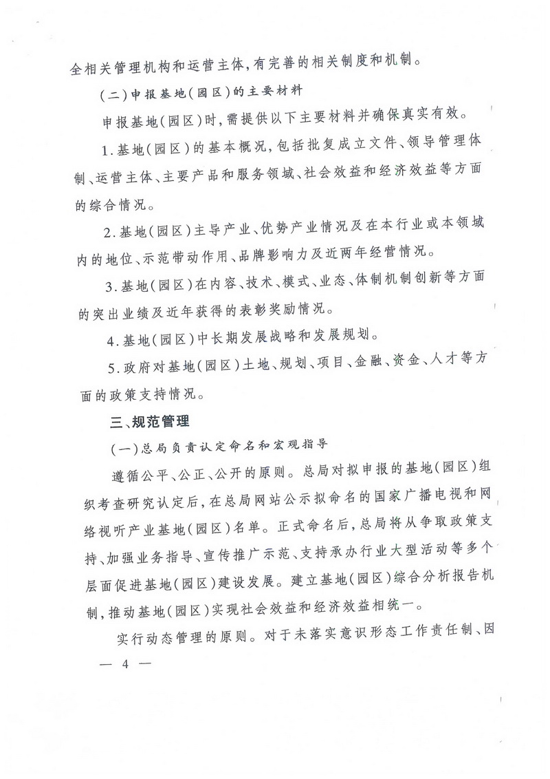 對總局此前已經(jīng)命名的基地(園區(qū)),屬于廣播電視和網(wǎng)絡視聽方面的,要進行全面梳理,按本通知精神納入統(tǒng)籌管理,推動轉型升級,并按上述時間要求報送年度發(fā)展情況報告。