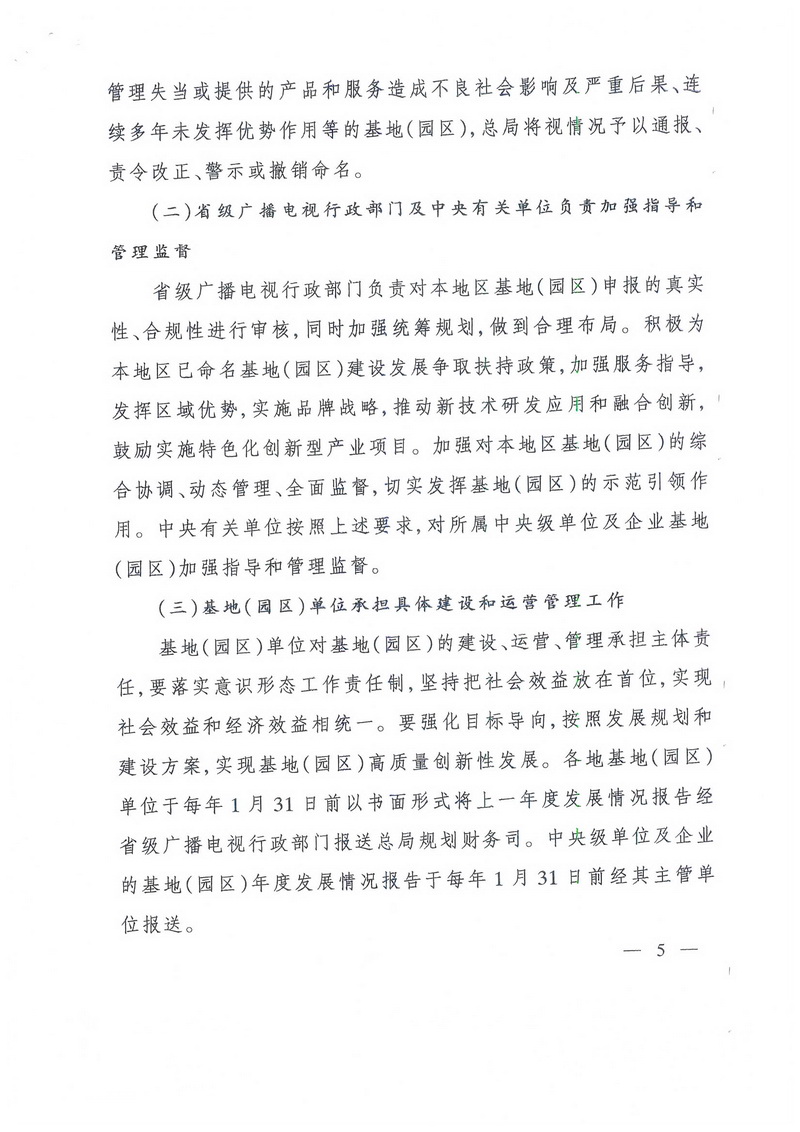 基地(園區(qū))單位對基地(園區(qū))的建設、運營、管理承擔主體責任,要落實意識形態(tài)工作責任制,堅持把社會效益放在首位,實現(xiàn)社會效益和經(jīng)濟效益相統(tǒng)一。要強化目標導向,按照發(fā)展規(guī)劃和建設方案,實現(xiàn)基地(園區(qū))高質量創(chuàng)新性發(fā)展。各地基地(園區(qū))單位于每年1月31日前以書面形式將上一年度發(fā)展情況報告經(jīng)省級廣播電視行政部門報送總局規(guī)劃財務司。中央級單位及企業(yè)的基地(園區(qū))年度發(fā)展情況報告于每年1月31日前經(jīng)其主管單位報送。