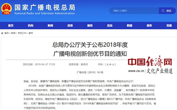 國家廣播電視總局辦公廳關于公布2018年度廣播電視創(chuàng)新創(chuàng)優(yōu)節(jié)目的通知