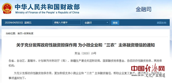 經(jīng)濟(jì)日?qǐng)?bào)-中國(guó)經(jīng)濟(jì)網(wǎng)北京4月3日訊 繼3月31日召開的國(guó)務(wù)院常務(wù)會(huì)議提出“降低政府性融資擔(dān)保費(fèi)率,減輕中小微企業(yè)綜合融資成本負(fù)擔(dān)”之后,4月1日財(cái)政部發(fā)布《關(guān)于充分發(fā)揮政府性融資擔(dān)保作用 為小微企業(yè)和“三農(nóng)”主體融資增信的通知》(以下簡(jiǎn)稱《通知》),要求地方各級(jí)政府性融資擔(dān)保、再擔(dān)保機(jī)構(gòu)2020年全年對(duì)小微企業(yè)減半收取融資擔(dān)保、再擔(dān)保費(fèi),力爭(zhēng)將小微企業(yè)綜合融資擔(dān)保費(fèi)率降至1%以下。進(jìn)一步提高支小支農(nóng)業(yè)務(wù)占比,確保2020年新增小微企業(yè)和“三農(nóng)”融資擔(dān)保金額和戶數(shù)占比不低于80%。