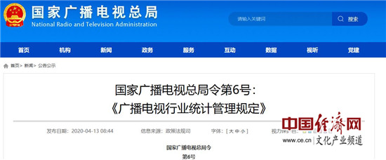 《廣播電視行業(yè)統(tǒng)計管理規(guī)定》已經(jīng)2020年3月20日國家廣播電視總局局務(wù)會議審議通過,現(xiàn)予公布,自2020年5月5日起施行。
