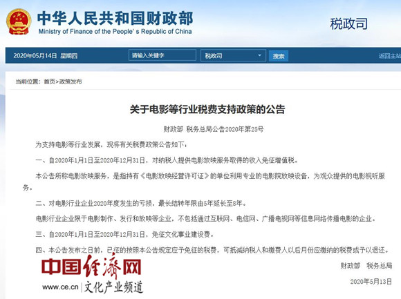 經(jīng)濟日報-中國經(jīng)濟網(wǎng)北京5月14日訊 2020年5月13日,財政部、稅務總局發(fā)布《關于電影等行業(yè)稅費支持政策的公告》。據(jù)經(jīng)濟日報-中國經(jīng)濟網(wǎng)文化產(chǎn)業(yè)頻道(微信號:cewenhua)了解,自2020年1月1日至2020年12月31日,對納稅人提供電影放映服務取得的收入免征增值稅。對電影行業(yè)企業(yè)2020年度發(fā)生的虧損,最長結轉(zhuǎn)年限由5年延長至8年。自2020年1月1日至2020年12月31日,免征文化事業(yè)建設費。