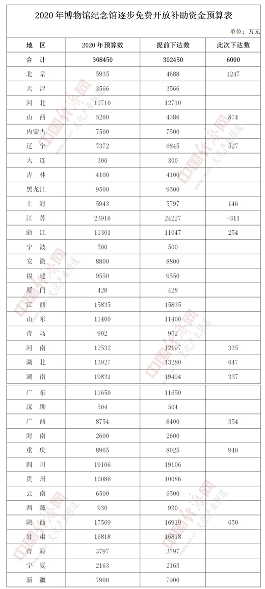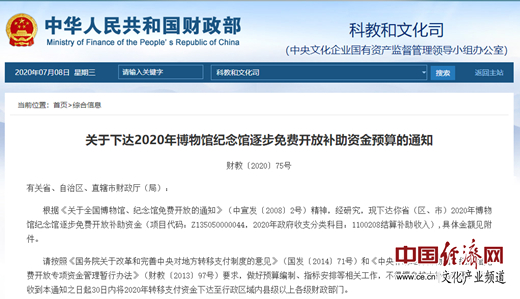 經(jīng)濟(jì)日?qǐng)?bào)-中國(guó)經(jīng)濟(jì)網(wǎng)北京7月8日訊 7日,國(guó)家財(cái)政部官網(wǎng)發(fā)布《關(guān)于下達(dá)2020年博物館紀(jì)念館逐步免費(fèi)開(kāi)放補(bǔ)助資金預(yù)算的通知》(以下簡(jiǎn)稱《通知》),《2020年博物館紀(jì)念館逐步免費(fèi)開(kāi)放補(bǔ)助資金預(yù)算表》同日公布。