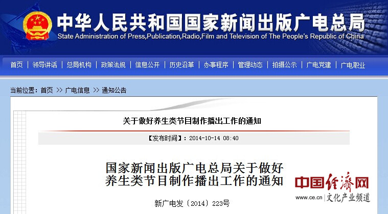 中國經(jīng)濟(jì)網(wǎng)北京10月22日訊 中國經(jīng)濟(jì)網(wǎng)文化產(chǎn)業(yè)頻道記者從國家新聞出版廣電總局網(wǎng)站獲悉,近日,國家新聞出版廣電總局針對養(yǎng)生類節(jié)目存在夸張宣傳、廣告植入等問題下發(fā)通知,規(guī)范養(yǎng)生類節(jié)目播出秩序。通知要求,電視養(yǎng)生類節(jié)目只能由電視臺策劃制作,不得由社會公司制作,并嚴(yán)禁以變相形式發(fā)布廣告等。以下為通知全文。