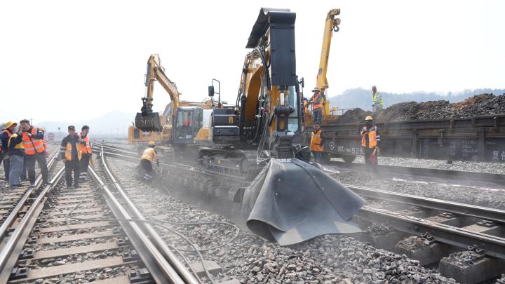 11時(shí)20分,隨著施工命令下達(dá),道岔清篩機(jī)率先啟動(dòng),巨大的挖掘鏈精準(zhǔn)探入道岔關(guān)鍵區(qū)域,在現(xiàn)場(chǎng)作業(yè)人員的配合下,將臟污的道砟挖出并輸送至線路一側(cè),再由帶篩網(wǎng)的鉤機(jī)將清理出的泥土廢砟清運(yùn)到軌道車的平板上。
