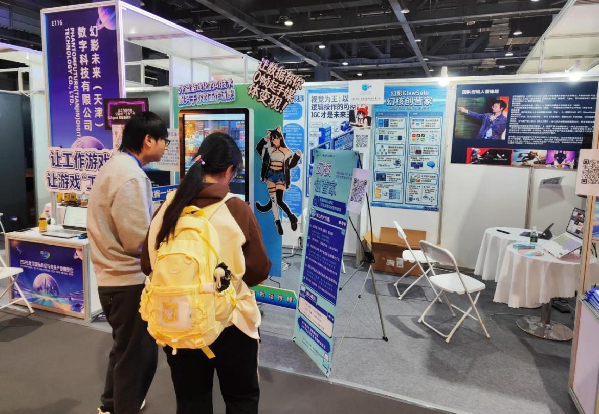 展館內(nèi),幻影未來(天津)數(shù)字科技有限公司的展位上顯示著像素風(fēng)格的辦公室界面,吸引著觀眾駐足。“我們使用數(shù)字人和像素風(fēng)辦公室界面作為前端,讓用戶和Agent互動更為直接簡單,真正實現(xiàn)‘工作變得像游戲一樣簡單’?!倍\超介紹,幻影未來是一家游戲與動畫垂類的技術(shù)型“OPC”,目前專注于AI Agent智能體技術(shù)自動化應(yīng)用,包含影視動畫、游戲交互、泛娛樂等,今年主打的核心產(chǎn)品是面向C端和小B端的ClawSolo項目。董錦超透露,除該項目外,他們深耕游戲和動畫垂類,與一些大廠達(dá)成長期合作開發(fā),與AI短劇平臺做聯(lián)合出品和制片任務(wù)。