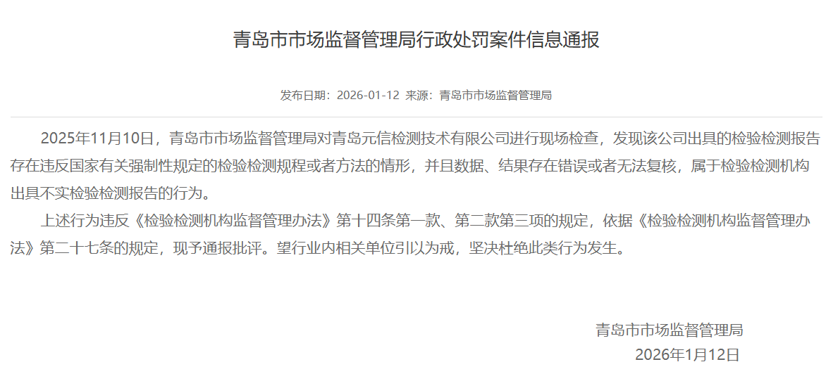 這場(chǎng)圍繞雞蛋角黃素的爭(zhēng)議,最早在今年“3?15”前后引發(fā)廣泛關(guān)注。某打假人連續(xù)發(fā)布檢測(cè)報(bào)告,稱在商超渠道購買的多款雞蛋中檢出角黃素,并點(diǎn)名黃天鵝等品牌,正式拉開事件序幕。隨著官方抽檢結(jié)果公布,個(gè)人送檢“檢出角黃素”與官方抽檢“未檢出角黃素”兩種結(jié)論并存,相關(guān)討論也從食品安全本身,進(jìn)一步延伸至檢測(cè)報(bào)告的公信力之爭(zhēng)。其中,為某打假人提供檢測(cè)報(bào)告的檢測(cè)機(jī)構(gòu)合規(guī)性備受質(zhì)疑:據(jù)青島市市場(chǎng)監(jiān)管局公開信息,青島元信檢測(cè)技術(shù)有限公司因“出具不實(shí)檢驗(yàn)檢測(cè)報(bào)告”“數(shù)據(jù)無法復(fù)核”等問題,已于2026年1月12日被行政處罰。