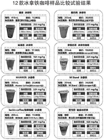 相比而言,12款冰拿鐵咖啡樣品的糖含量、脂肪、能量的檢測數(shù)值比冰美式咖啡樣品要高,但12款冰拿鐵咖啡樣品的糖含量均達到標準的“低糖”要求。