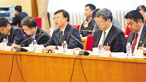 上圖 3月12日,人大內(nèi)蒙古代表團(tuán)舉行全體會(huì)議。全國(guó)人大代表、內(nèi)蒙古自治區(qū)包頭市市長(zhǎng)趙江濤(中)表示,生態(tài)文明建設(shè)利國(guó)利民。 本報(bào)記者 李景錄攝