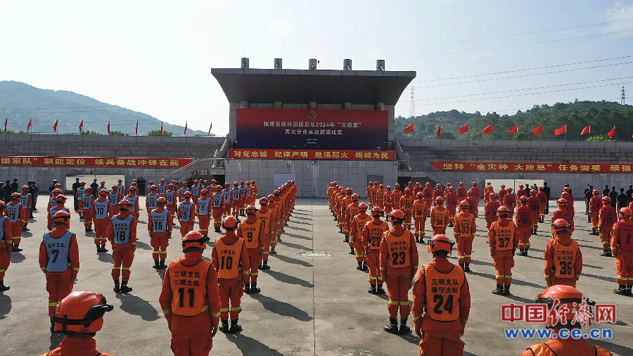 福建省森林消防總隊2024年“火焰藍(lán)”滅火專業(yè)實戰(zhàn)技能比武開幕式現(xiàn)場。 蔡增欣/攝