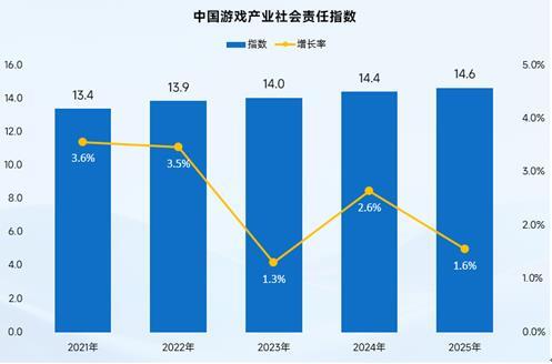 近日,伽馬數(shù)據(jù)發(fā)布了《2025中國游戲企業(yè)社會(huì)責(zé)任報(bào)告》(下稱“報(bào)告”),報(bào)告公布:2025年中國游戲產(chǎn)業(yè)社會(huì)責(zé)任指數(shù)為14.6,同比增長(zhǎng)1.6%,中國游戲產(chǎn)業(yè)首席分析師王旭認(rèn)為,游戲企業(yè)公益實(shí)踐的深化履責(zé)是指數(shù)增長(zhǎng)的重要原因之一。在公益、合規(guī)、經(jīng)濟(jì)等多維度共同作用下,指數(shù)實(shí)現(xiàn)穩(wěn)步增長(zhǎng)。