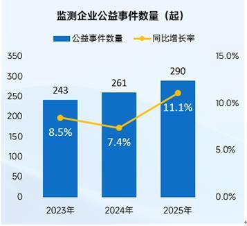 首先,在公益事件數(shù)量層面,2025年監(jiān)測(cè)企業(yè)公益事件數(shù)量達(dá)290起,同比增長(zhǎng)11.1%,在保持連續(xù)增長(zhǎng)的基礎(chǔ)上進(jìn)一步擴(kuò)大增幅。