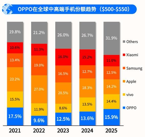500–550 美元是全球智能手機(jī)市場(chǎng)公認(rèn)的"高端入口"價(jià)格帶,是所有手機(jī)廠商的必爭(zhēng)之地。IDC 數(shù)據(jù)顯示,2025 年 OPPO 在這一價(jià)格段的全球市場(chǎng)份額已穩(wěn)居行業(yè)第一,成為該價(jià)格區(qū)間市場(chǎng)領(lǐng)導(dǎo)者。