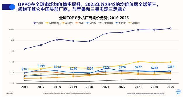 均價(jià)是衡量品牌高端化成色最直接的標(biāo)尺。IDC 數(shù)據(jù)顯示,2025 年 OPPO 全球智能手機(jī)均價(jià)達(dá) 284 美元,在全球出貨量 TOP 8 廠商中僅次于蘋果與三星,位列第三,同時(shí)以顯著優(yōu)勢(shì)領(lǐng)跑所有其他中國(guó)頭部手機(jī)品牌。