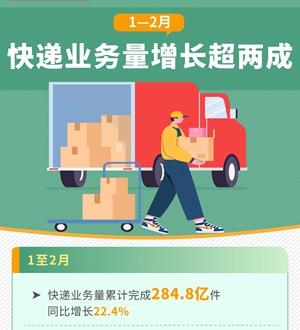 1至2月,快遞業(yè)務(wù)量保持快速攀升,累計完成284.8億件,同比增長22.4%。