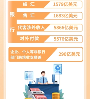 2月,銀行結(jié)匯1579億美元,售匯1683億美元;銀行代客涉外收入5866億美元,對外付款5576億美元。