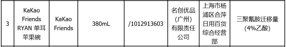 今年6月,上海市市場監(jiān)管局網(wǎng)站發(fā)布的《2019年上海市兒童用餐具(密胺餐具)質(zhì)量監(jiān)督抽查結(jié)果》顯示,標(biāo)稱名創(chuàng)優(yōu)品(廣州)有限責(zé)任公司生產(chǎn)的標(biāo)稱KaKao Friends RYAN 單耳蘋果碗(規(guī)格型號:380mL)被檢出三聚氰胺遷移量(4%乙酸)項(xiàng)目不合格。