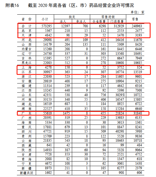 相反,在有“紅線”限制地區(qū)的北京、上海天津一帶,其零售連鎖和零售藥店卻少之又少。如上海,截止2020年底,其零售連鎖卻只有3804家,零售藥店僅有324家。