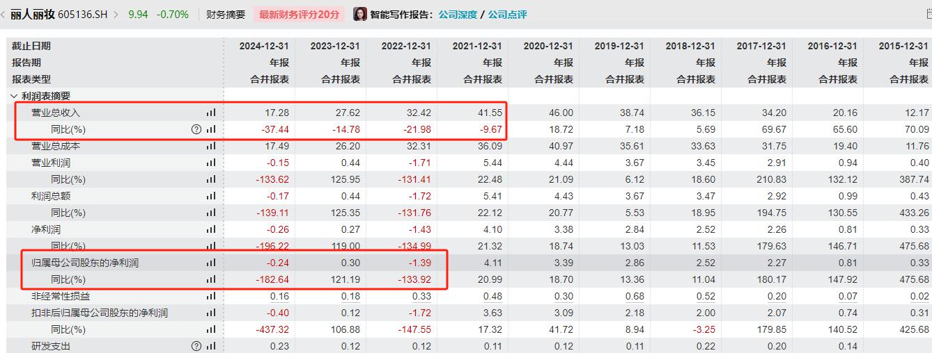 Wind顯示,2021年至2024年,麗人麗妝營收持續(xù)回落,歸母凈利潤在2022年、2024年出現(xiàn)虧損。