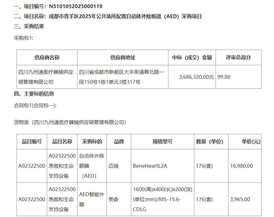 中國(guó)經(jīng)濟(jì)網(wǎng)北京8月5日訊(記者 郭文培)8月4日,中國(guó)政府采購(gòu)網(wǎng)披露《成都市青羊區(qū)衛(wèi)生健康局成都市青羊區(qū)2025年公共場(chǎng)所配置自動(dòng)體外除顫器(AED)采購(gòu)項(xiàng)目中標(biāo)(成交)結(jié)果公告》。四川九州通醫(yī)療器械供應(yīng)鏈管理有限公司中標(biāo)成都市青羊區(qū)2025年公共場(chǎng)所配置自動(dòng)體外除顫器(AED)采購(gòu)項(xiàng)目,中標(biāo)(成交)金額額3686320.00元。