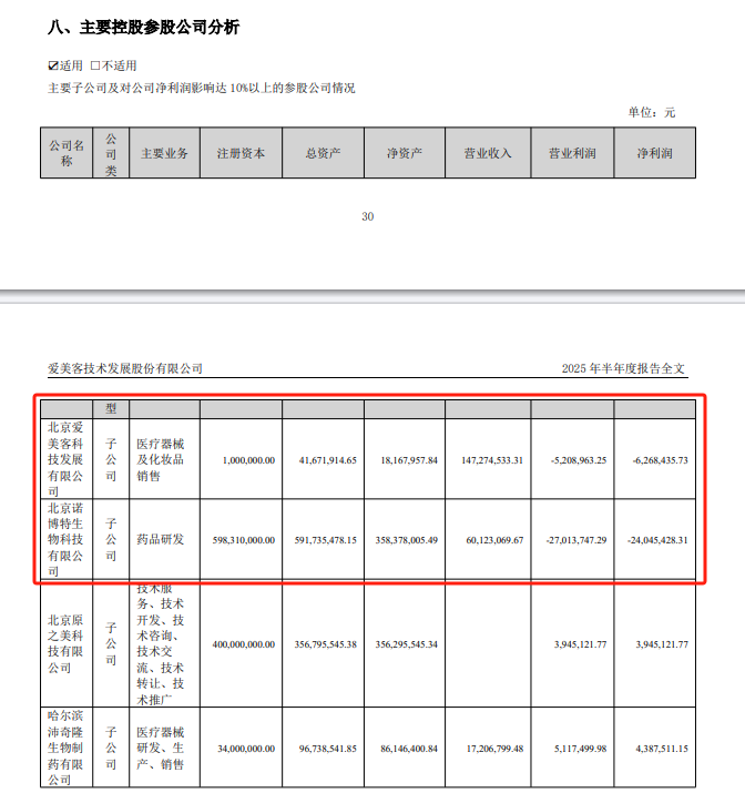 具體來看,其主要控股參股公司表現(xiàn)并不樂觀。半年報顯示,愛美客主要子公司及對公司凈利潤影響達10%以上的參股公司有4家,其中2家處于虧損狀態(tài)。北京愛美客科技發(fā)展有限公司凈利潤為-6268435.73元,北京諾博特生物科技有限公司凈利潤為-24045428.31元,2家虧損金額逾3000萬元。