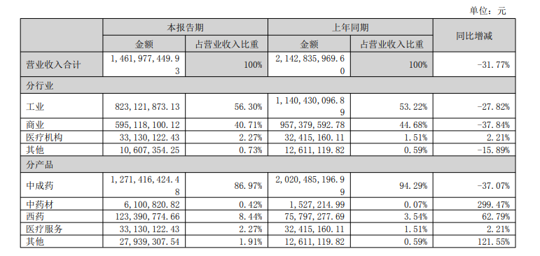 根據(jù)半年報,醫(yī)藥工業(yè)仍是貴州百靈業(yè)績重要支撐,貢獻(xiàn)逾一半營收。具體來看,工業(yè)實現(xiàn)營收8.23億元,同比下降27.82%;商業(yè)實現(xiàn)營收5.95億元,同比下降37.84%;醫(yī)療機構(gòu)實現(xiàn)營收0.33億元,同比增長2.21%;其他實現(xiàn)營收0.11億元,同比下降15.89%。