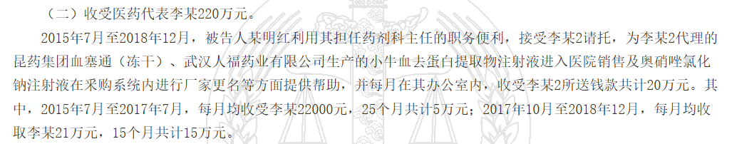 根據(jù)判決書(shū),2015年7月至2018年12月,被告人某明紅利用其擔(dān)任藥劑科主任的職務(wù)便利,接受“李某2”請(qǐng)托,為“李某2”代理的昆藥集團(tuán)血塞通(凍干)、武漢人福藥業(yè)有限公司生產(chǎn)的小牛血去蛋白提取物注射液進(jìn)入醫(yī)院銷售及奧硝唑氯化鈉注射液在釆購(gòu)系統(tǒng)內(nèi)進(jìn)行廠家更名等方面提供幫助,并每月在其辦公室內(nèi),收受“李某2”所送錢款共計(jì)20萬(wàn)元。