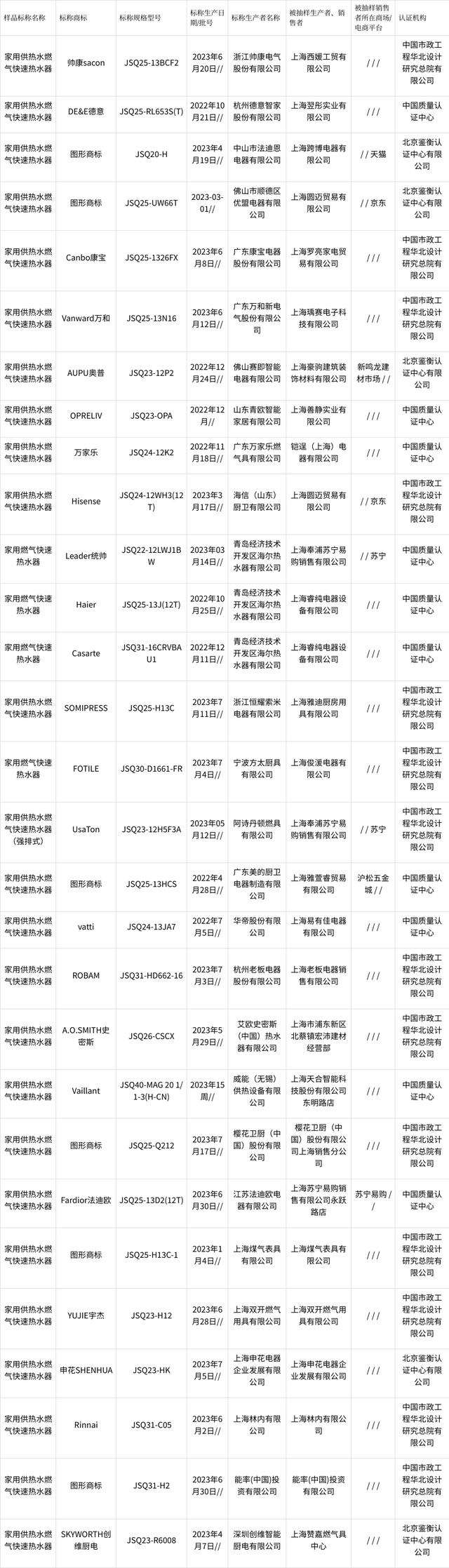 2023年上海市家用燃?xì)饪焖贌崴鳟a(chǎn)品質(zhì)量監(jiān)督抽查所檢項目符合相關(guān)標(biāo)準(zhǔn)的產(chǎn)品